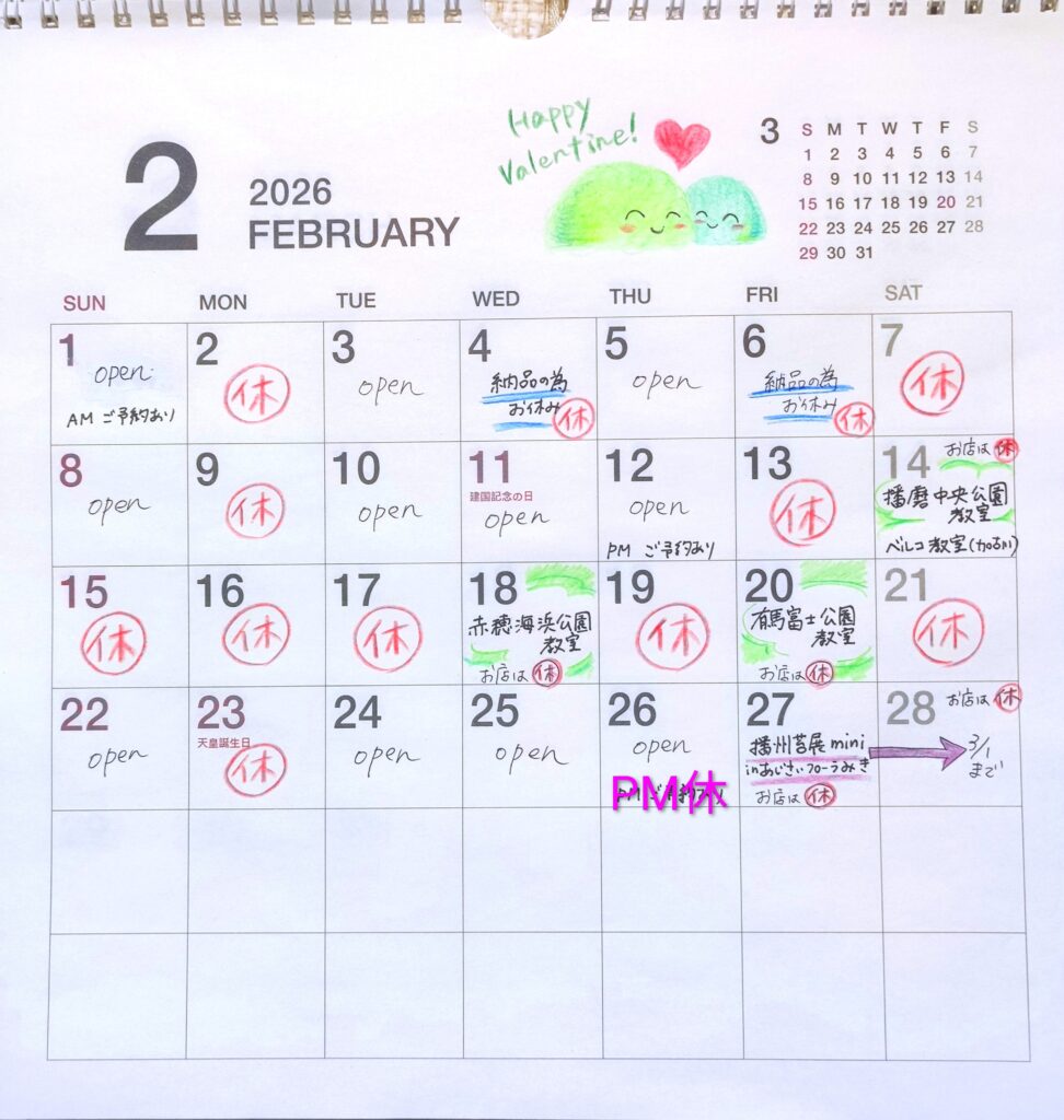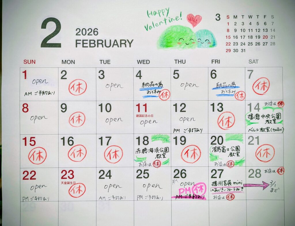 2月は一番寒いので外出店はせず、あたたかいお部屋で教室をさせていただきます。