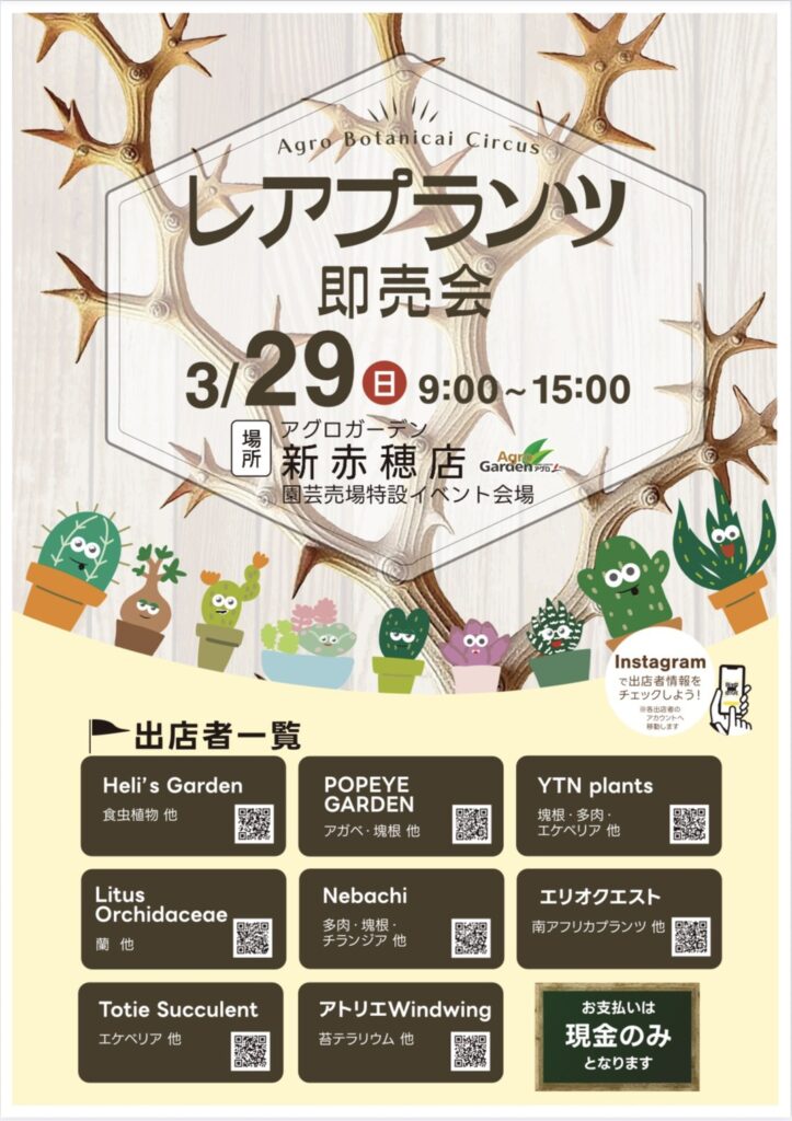 園芸用品を販売されているアグロガーデン赤穂店様にて、レアプランツ即売会が開催されます。当店もお声掛けいただき物販のみさせていただきます。